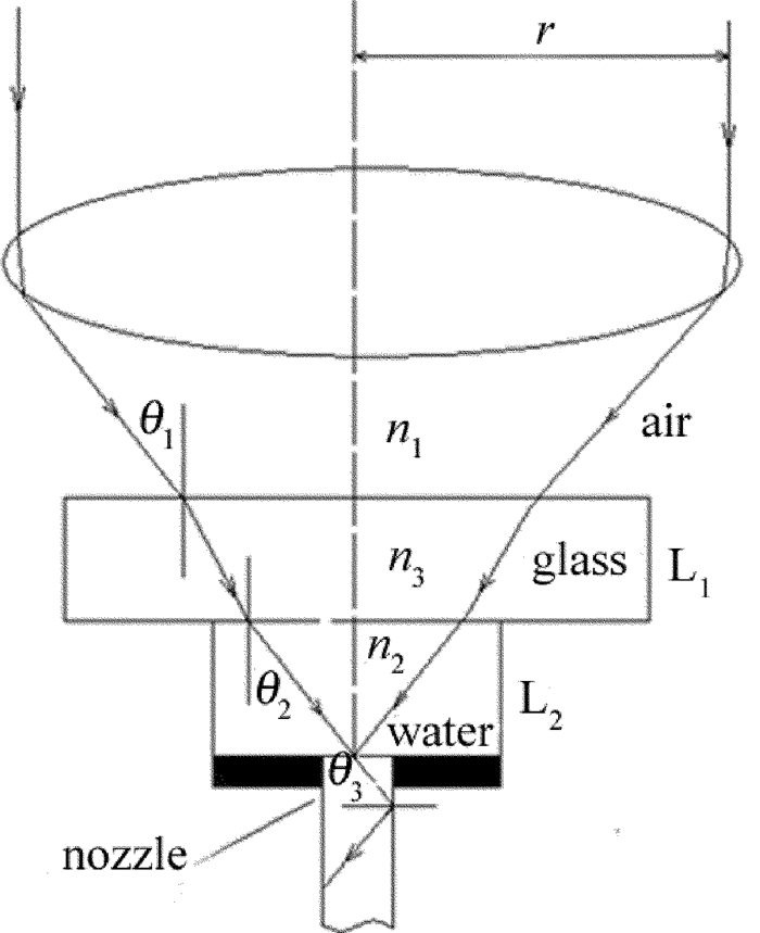 激光耦合即激光束在微水束中發生多次全反射后形成高能量束并在微水束中傳輸的過程。耦合期間激光束要依次經過空氣層、玻璃層L1、水層L2并進入到水束光纖的開始端[13-14],如圖 1所示。