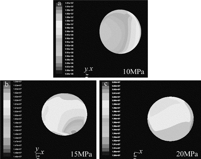 首先是殘差圖的收斂計算,設計的收斂參量為1×10-3。圖 4為殘差圖的收斂計算結果,橫坐標為迭代次數,縱坐標為殘差值的大小。圖 5為單注水口耦合腔頂部水流入口壓力分布圖,縱坐標為水束壓力大小(MPa)。由圖 5可以看出:當水束壓力為10MPa時,水流入口處壓力分布非常不均勻,具有明顯的各向異性,且注水口一側的壓力明顯較大;隨著水束壓力的不斷增大,水束壓力的各向異性逐漸減弱,在水束壓力達到20MPa時,入口的水壓趨近均勻。
