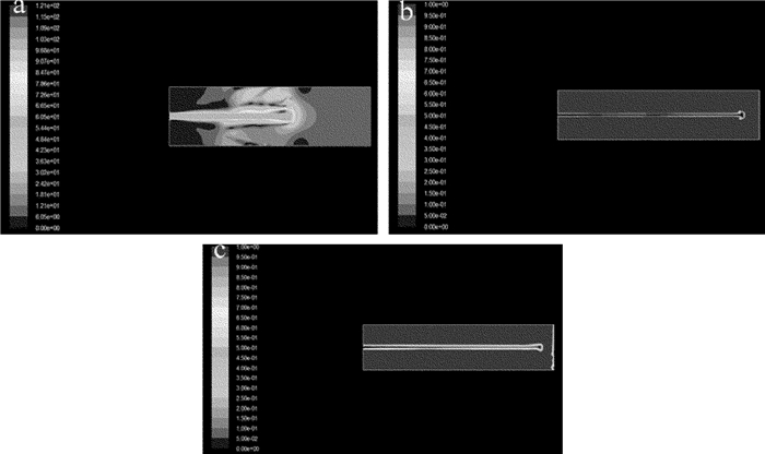 經光液耦合后的水束噴射到空氣中的情況是比較復雜的。水束會在噴口處發生縮流,水束會突然縮小為原來的80%,然后水束在空氣壓力的作用下,其直徑又慢慢變大,最終導致激光束從水束中逃逸。噴嘴口的大小和水束的流速均會影響噴射流長度,本次仿真選取水束壓力為20MPa,依次對0.3mm, 0.4mm及0.5mm 3種口徑噴嘴射出的水束穩定性進行仿真,如圖 7所示。本次仿真設置的邊界為100mm。